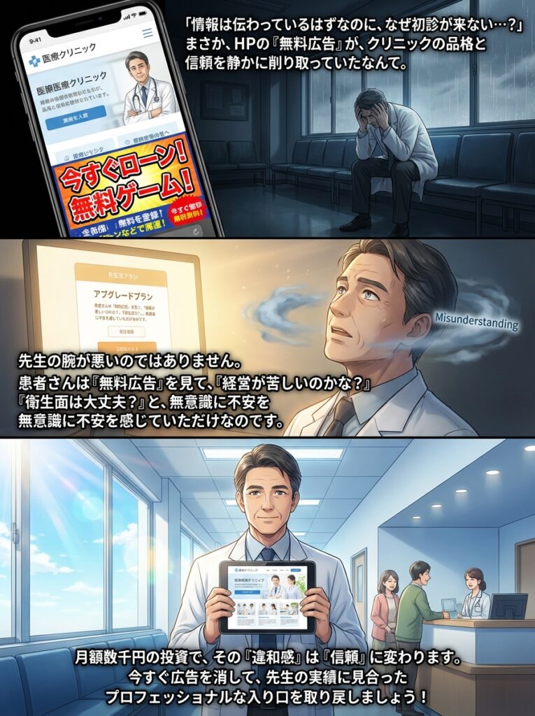 50代の開業医向けに、無料ホームページに表示される広告がクリニックの信頼性を損なうリスクと、具体的な広告削除・改善方法を解説。医療広告ガイドラインの観点からも、有料プランへの移行や医療特化型サービスへの乗り換えを推奨。