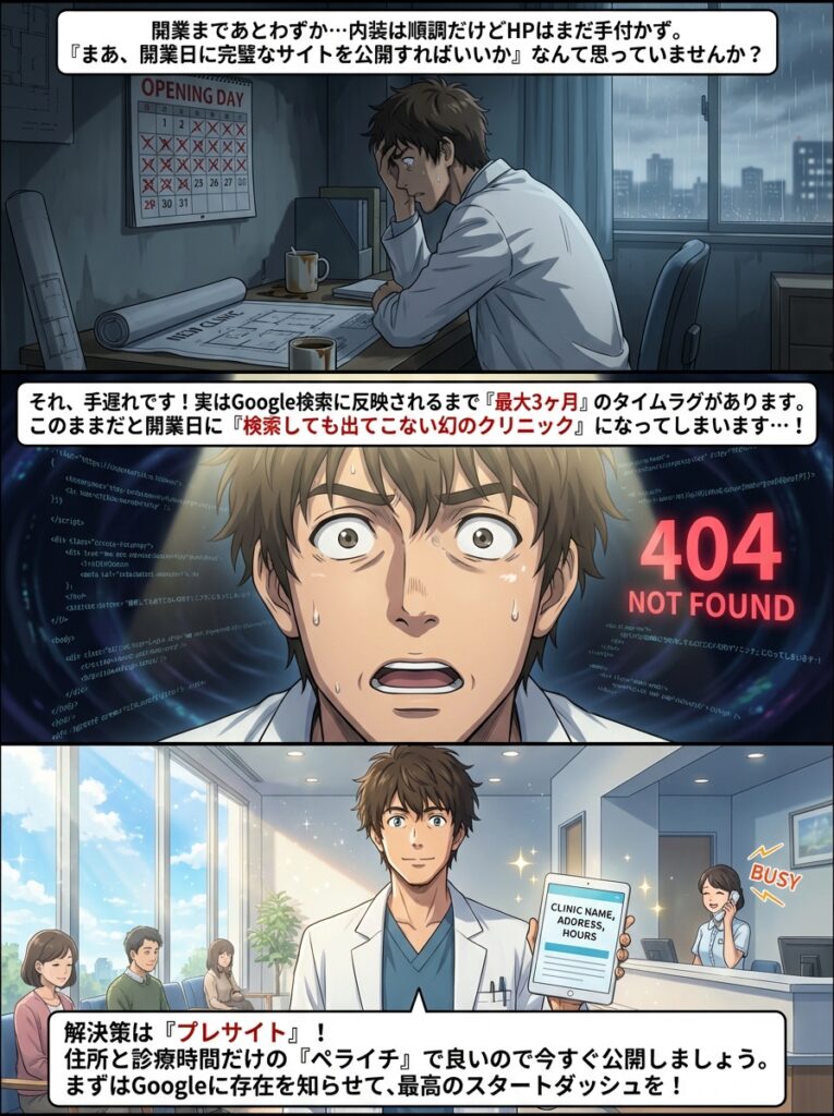 開業医の皆様へ。ホームページ制作が後回しになっていませんか?競合に差をつける「プレサイト(仮公開)」で開業後すぐに集患をスタートできる、最短・最安の逆算型エマージェンシー・プランを解説します。 -