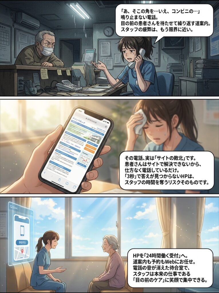 開業して5〜10年が経過した40代・50代のクリニック院長様へ。ホームページの「情報設計」と「行動デザイン」で電話を3割減らし、スタッフの負担軽減と患者満足度向上を実現する具体策を解説します。 -