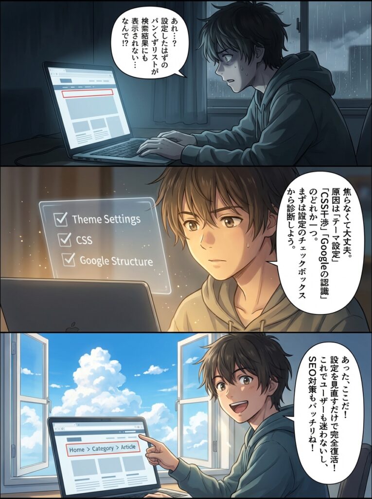 パンくずリストが表示されない原因と解決策|テーマ別設定からCSS・構造化データまで網羅