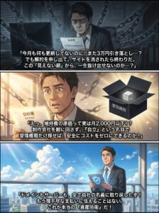 にもかかわらず、多くの制作会社は当たり前のように「月額保守費 3万円」や「管理費 5万円」といった見積もりを出してきます。「ITは詳しくないから、プロに任せないと怖い」という先生の不安につけ込み、何も更新作業が発生しない月でさえ費用を徴収するサブスクリプション契約を結ばせようとするのです。