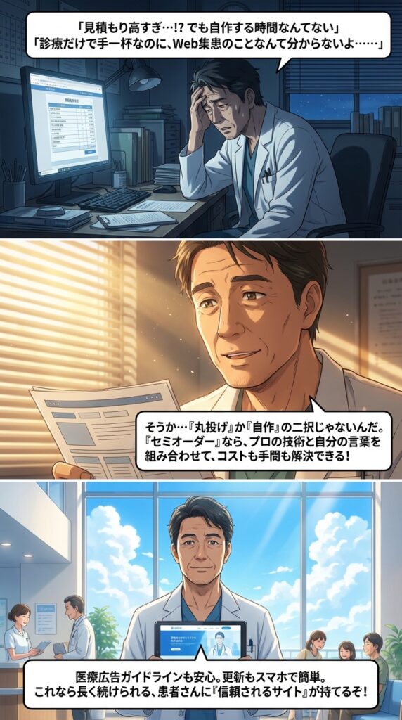 開業医の皆様へ。IT知識がなくても、法規制を遵守し、患者さんに信頼される医院ホームページを「簡単」に作る方法を解説。3つの選択肢と失敗しない選び方、必須コンテンツまで網羅。 -