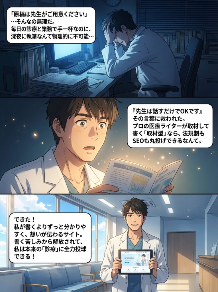 「ホームページをリニューアルしたいが、原稿を書く時間がどうしても作れない…」そんな院長先生の悩みを解決!医療広告ガイドラインを遵守し、医師の執筆なしで高品質なサイトを制作する「原稿不要」プランの選び方と注意点を解説します。 -