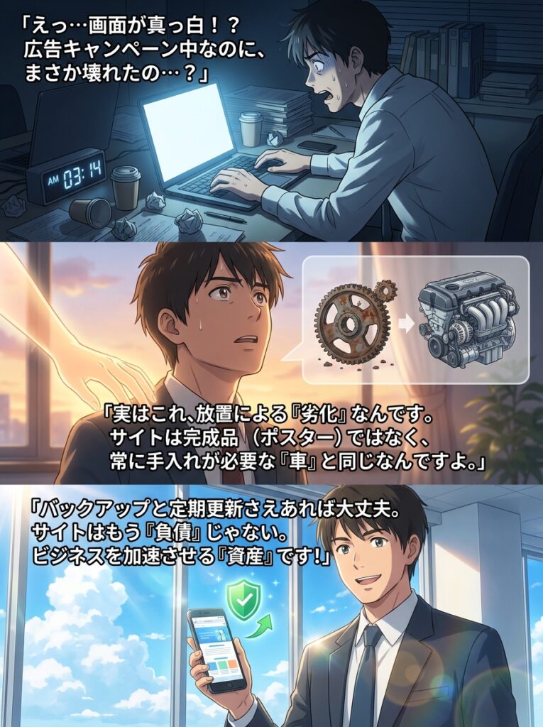 「サイトが完成したから、これで一安心」——そう思っていませんか?実は、WordPressは納品された瞬間から『劣化』が始まっています。メンテナンスをせずに放置することは、新車を買ってから一度もオイル交換をせずに高速道路を走るようなものです。本記事では、納品後に放置すると具体的に何が起きるのか、そして今日からあなた自身でできる最低限の守り方を分かりやすく解説します。 -
