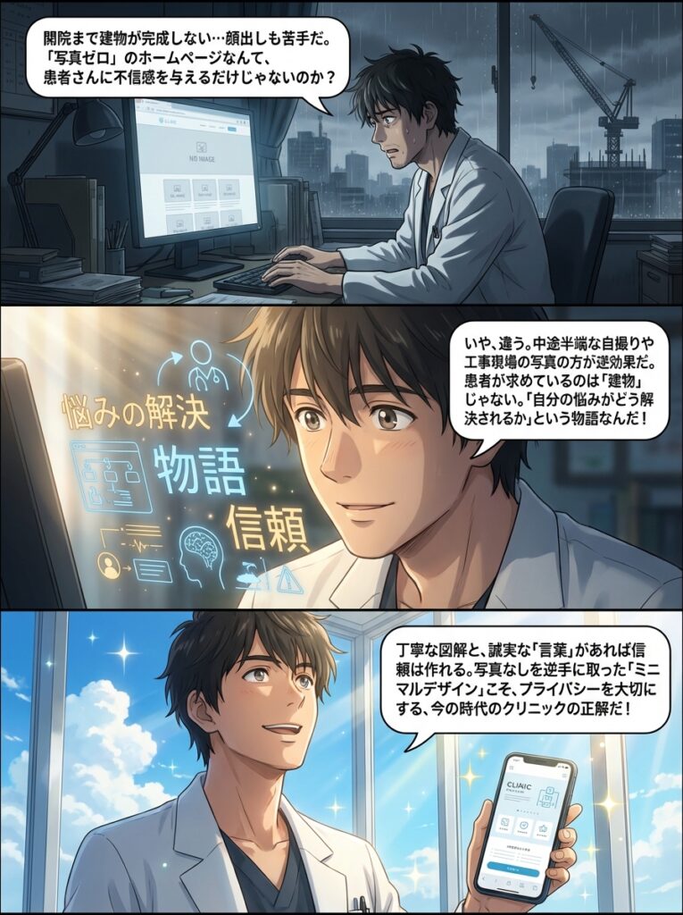 新規開業クリニックのホームページ制作で、写真がない場合の具体的なデザイン戦略を解説。イラストやインフォグラフィック活用、医療広告ガイドライン遵守、信頼を勝ち取る情報設計のポイント。 -