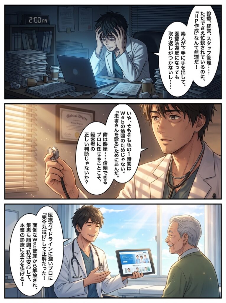 新規開業・リニューアルを控えた多忙なクリニック院長必見!医療広告ガイドラインを遵守し、最小限の労力で「賢く丸投げ」して質の高いホームページを手に入れる方法を解説。失敗しない制作会社の選び方、チェックポイント、費用相場まで。 -