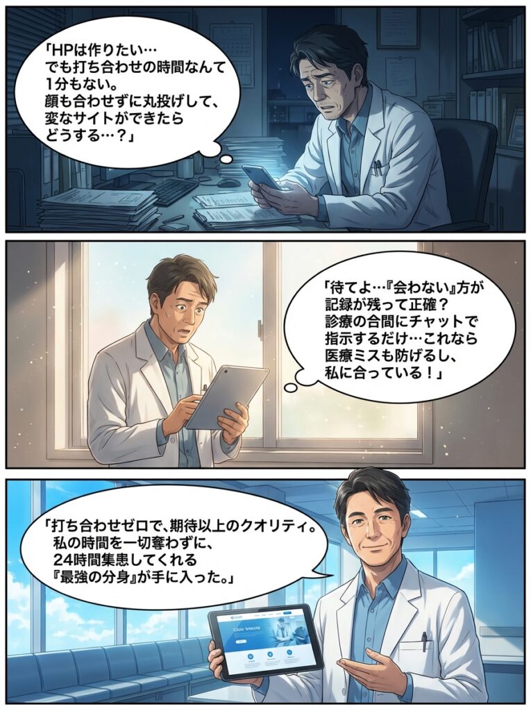 クリニックのホームページ制作を「打ち合わせなし」で成功させる全条件|忙しい院長の時間を奪わない制作手法とは