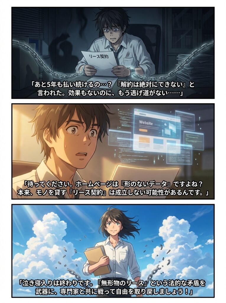 「月々の支払いが苦しい、でも解約は絶対にできないと言われた……」と絶望していませんか?実は、ホームページは本来リースになじまない性質を持っており、契約そのものに疑義を挟めるケースが少なくありません。本記事では、解約できないという呪縛を解き、具体的な脱出ルートを解説します。